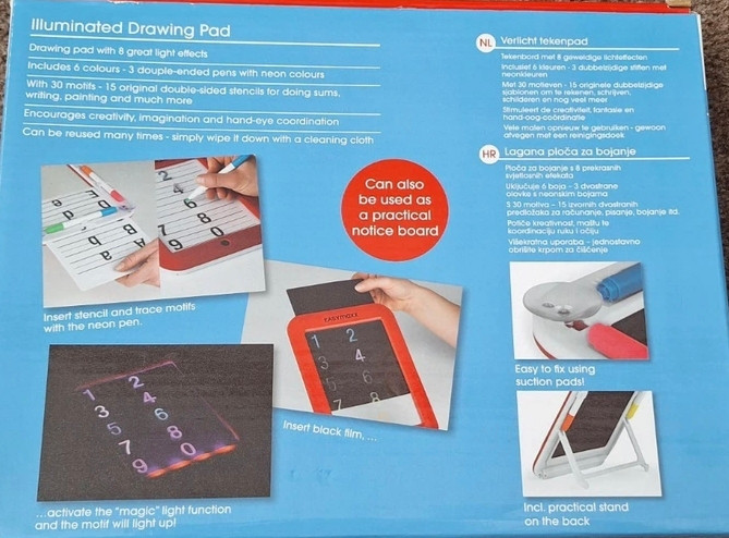 همچنین به تقویت خلاقیت و هماهنگی چشم و دست و همچنین لذت یادگیری کمک میکند - کافیست شابلونها را وارد کنید، با قلمها نقاشی کنید و با نور LED روشن شوید. سپس تخته را میتوان با پارچه تمیز کرد و بارها و بارها از آن استفاده کرد