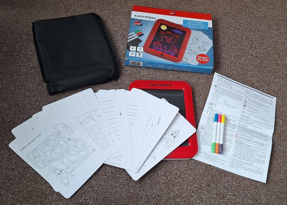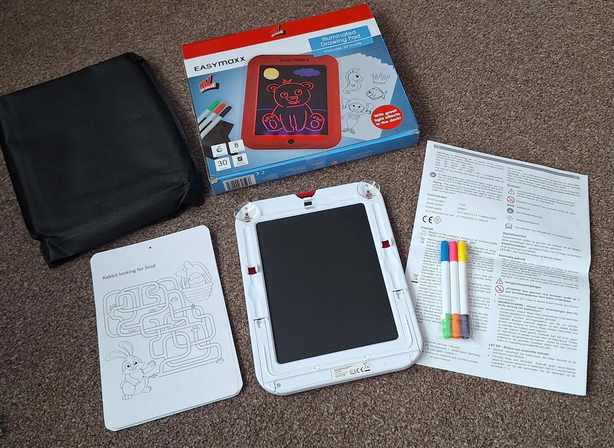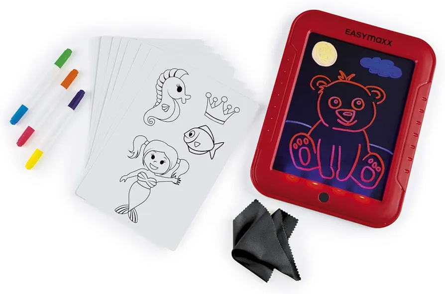 هنرمندان بزرگ و کوچک اکنون میتوانند لذت یادگیری و نقاشی را با پد نقاشی نورانی EASYmaxx کشف کنند. این تخته نقاشی مبتکرانه با طراحی تبلت، 30 طرح روی 15 شابلون و 3 مداد رنگی نئونی دوتایی با 6 رنگ عالی ارائه میدهد که تمام الزامات یادگیری شاد و رنگارنگ و لذت نقاشی را برآورده میکند
