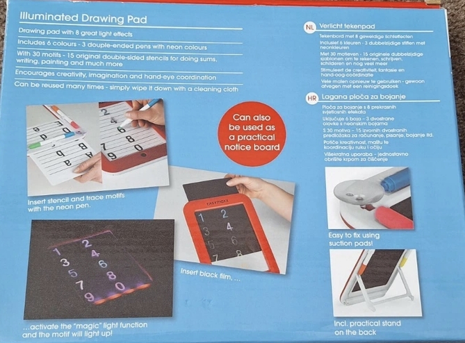 همچنین به تقویت خلاقیت و هماهنگی چشم و دست و همچنین لذت یادگیری کمک میکند - کافیست شابلونها را وارد کنید، با قلمها نقاشی کنید و با نور LED روشن شوید. سپس تخته را میتوان با پارچه تمیز کرد و بارها و بارها از آن استفاده کرد