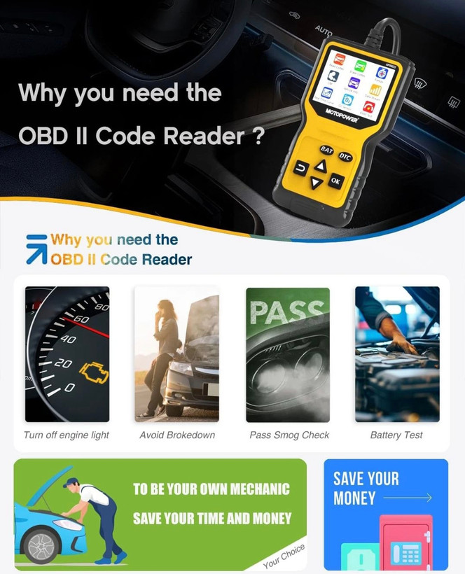 دستگاه کدخوان OBD و تستر باتری - دستگاه کدخوان OBD2 چندمنظوره کاربردی دارای کتابخانه جستجوی DTC داخلی OBD2 است که به شما کمک میکند تا علت روشن شدن موتور را تعیین کنید، کد را بخوانید، کد را پاک کنید، قاب توقف را مشاهده کنید، آماده I/M باشید، اطلاعات خودرو، جریان دادهها، منحنی زمان واقعی، اطلاعات سرعت خودرو را دریافت کنید، مقدار بار، دمای مایع خنککننده موتور را دریافت کنید، سرعت موتور را دریافت کنید. میتوانید از آن برای بررسی کدهای خطا به صورت شخصی و نمایش تعاریف کد، درک سلامت خودرو و آمادگی کامل برای رفتن به تعمیرگاه خودرو برای تعمیر و نگهداری خودرو استفاده کنید.