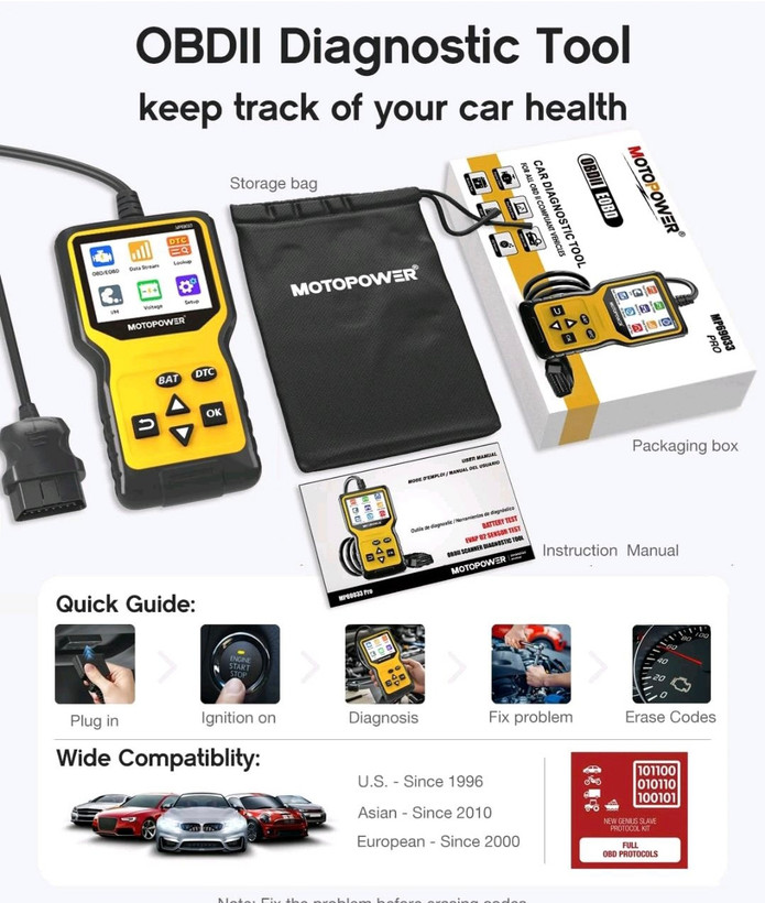 سازگاری گسترده با خودرو - اسکنر اتوماتیک حرفهای OBD2 از تمام پروتکلهای OBDII مانند KWP2000، J1850 VPW، ISO9141، J1850 PWM و CAN پشتیبانی میکند. با اکثر خودروهای آمریکایی 1996 و جدیدتر، خودروهای اتحادیه اروپا و آسیایی 2000، کامیونهای سبک، SUVها و خودروهای OBD2 و CAN جدیدتر در داخل و خارج از کشور کار میکند. لطفاً قبل از خرید، سازگاری با مدل خود را بررسی کنید. کدخوان OBD2 از 8 زبان پشتیبانی میکند - انگلیسی، آلمانی، هلندی، اسپانیایی، فرانسوی، ایتالیایی، روسی و چینی.