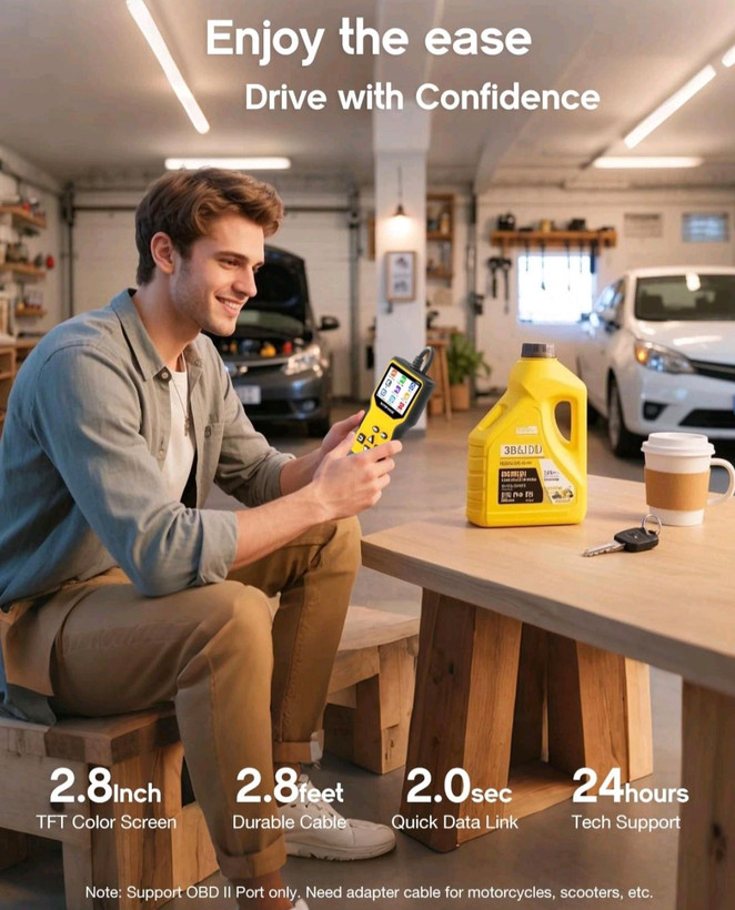 قابلیت اتصال و استفاده برای هر راننده - بدون نیاز به برنامه یا وایفای. بدون نیاز به باتری یا شارژر اضافی. کابل بلند به فضاهای تنگ میرسد، در حالی که منوی بصری بلافاصله پس از خارج شدن از جعبه کار میکند. ایدهآل برای کسانی که خودشان کار میکنند و مکانیکها.
