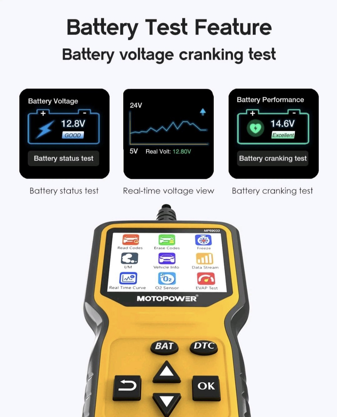 دستگاه کدخوان OBD و تستر باتری - دستگاه کدخوان OBD2 چندمنظوره کاربردی دارای کتابخانه جستجوی DTC داخلی OBD2 است که به شما کمک میکند تا علت روشن شدن موتور را تعیین کنید، کد را بخوانید، کد را پاک کنید، قاب توقف را مشاهده کنید، آماده I/M باشید، اطلاعات خودرو، جریان دادهها، منحنی زمان واقعی، اطلاعات سرعت خودرو را دریافت کنید، مقدار بار، دمای مایع خنککننده موتور را دریافت کنید، سرعت موتور را دریافت کنید. میتوانید از آن برای بررسی کدهای خطا به صورت شخصی و نمایش تعاریف کد، درک سلامت خودرو و آمادگی کامل برای رفتن به تعمیرگاه خودرو برای تعمیر و نگهداری خودرو استفاده کنید.