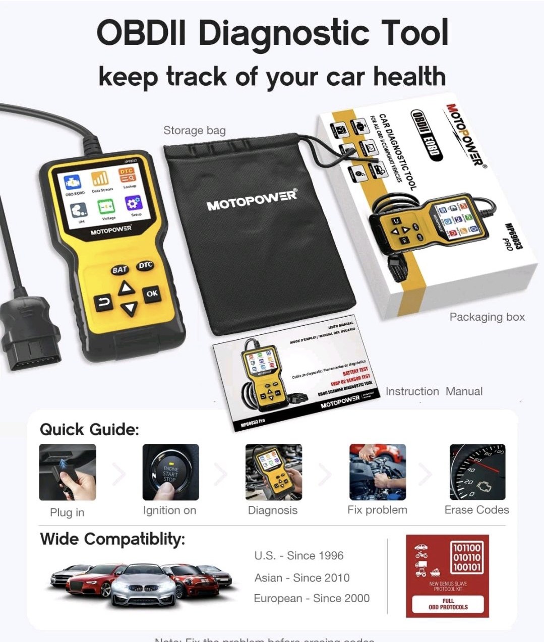 سازگاری گسترده با خودرو - اسکنر اتوماتیک حرفهای OBD2 از تمام پروتکلهای OBDII مانند KWP2000، J1850 VPW، ISO9141، J1850 PWM و CAN پشتیبانی میکند. با اکثر خودروهای آمریکایی 1996 و جدیدتر، خودروهای اتحادیه اروپا و آسیایی 2000، کامیونهای سبک، SUVها و خودروهای OBD2 و CAN جدیدتر در داخل و خارج از کشور کار میکند. لطفاً قبل از خرید، سازگاری با مدل خود را بررسی کنید. کدخوان OBD2 از 8 زبان پشتیبانی میکند - انگلیسی، آلمانی، هلندی، اسپانیایی، فرانسوی، ایتالیایی، روسی و چینی.
