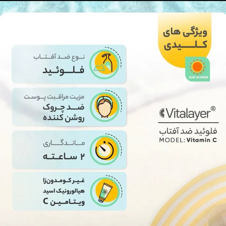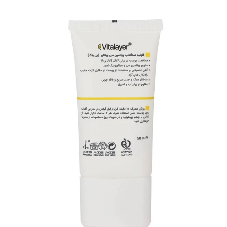 فلوئید ضد آفتاب بی رنگ ویتالیر 50 SPF مدل Vitamin C مناسب انواع پوست حجم 50 میلی لیتر فلوئید ضد آفتاب یکی از محصولاتی است که برای حفاظت از پوست در برابر اشعه های خورشیدی استفاده میشود. ویتالیر مدل Vitamin C یکی از فلوئیدهای ضد آفتاب پرطرفدار است که ویژگیهای بسیاری دارد. در ادامه به بررسی ویژگیهای این فلوئید ضد آفتاب پرداخته میشود ویژگی های فلوئید ضد آفتاب بی رنگ ویتالیر مدل Vitamin C بی رنگ فلوئید ضد آفتاب ویتالیر مدل Vitamin C بی رنگ است و باعث میشود پوست شما از هیچ گونه اثری از فلوئید ضد آفتاب پشت سر نماند. راهنمای استفاده برای استفاده روزانه ابتدا اجازه دهید کرم کاملا جذب پوست شده، سپس آرایش انجام شود. 15 دقیقه قبل از قرار گرفتن در معرض آفتاب به مقدار دلخواه به شکل یکدست روی پوست استفاده شود بعد از شنا یا عرق کردن و حداقل هر 2 ساعت آنرا تجدید نمایید. نتیجه گیری با توجه به مطالب بالا میتوان گفت که فلوئید ضد آفتاب بی رنگ ویتالیر 50 SPF مدل Vitamin C یک محصول کامل و ایده ال برای محافظت از پوست در برابر آسیبهای نور آفتاب و آلودگی هوا است. این کرم علاوه بر داشتن فیلترهای قوی و تکنولوژیهای پیشرفته با ایجاد یک رنگ یکنواخت و زیبا روی پوست خاصیت آرایشی نیز دارد. این فلوئید با انواع پوست سازگار است و بافت سبک و مخملی آن باعث میشود که پوست شما نرم و لطیف باشد. اگر شما هم دنبال یک فلوئید ضد آفتاب حرفه ای و با کیفیت هستید پیشنهاد میکنیم این محصول را از دست ندهید.