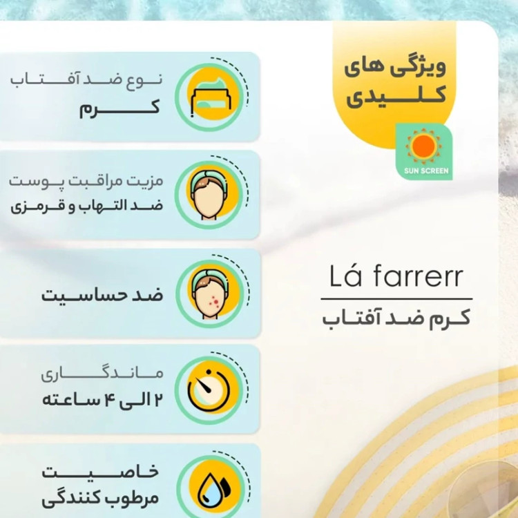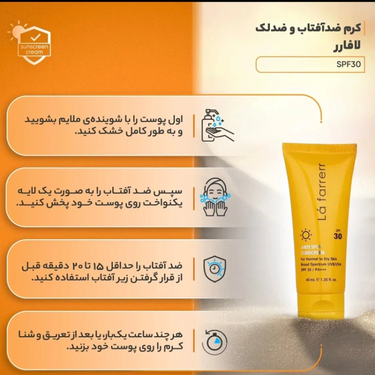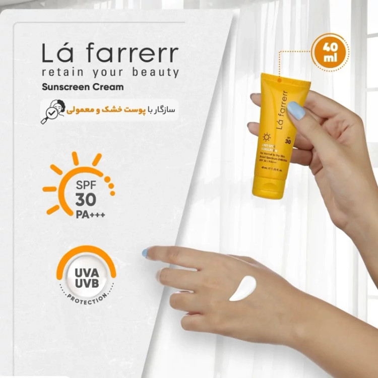 کرم ضد آفتاب و ضد لک بی رنگ لافارر با SPF30 حاوی محافظ UVA UVB و +++PA مناسب پوستهای خشک و معمولی حجم 40 میلی لیتر کرم ضد آفتاب و ضدلک بی رنگ لافارر با SPF30 حاوی محافظ UVA UVB و + ++PA مناسب پوستهای خشک و معمولی حجم 40 میلی لیتر یک گزینه ایده آل برای افرادی است که به دنبال محافظت کامل و همزمان زیبایی پوست خود هستند. این کرم با فرمولاسیون ویژه ای که دارد علاوه بر محافظت در برابر اشعه های مضر دارای خاصیت ضدلک و مات کنندگی پوست است. به طور کلی کرم های ضد آفتاب نه تنها از پوست در برابر اشعه های مضر خورشید محافظت میکنند بلکه میتوانند در بهبود ظاهر و سلامت پوست نیز نقش مهمی داشته باشند.